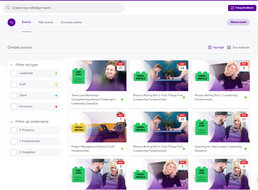 - Al je interne trainingen, workshops en sessies in één leerkalender