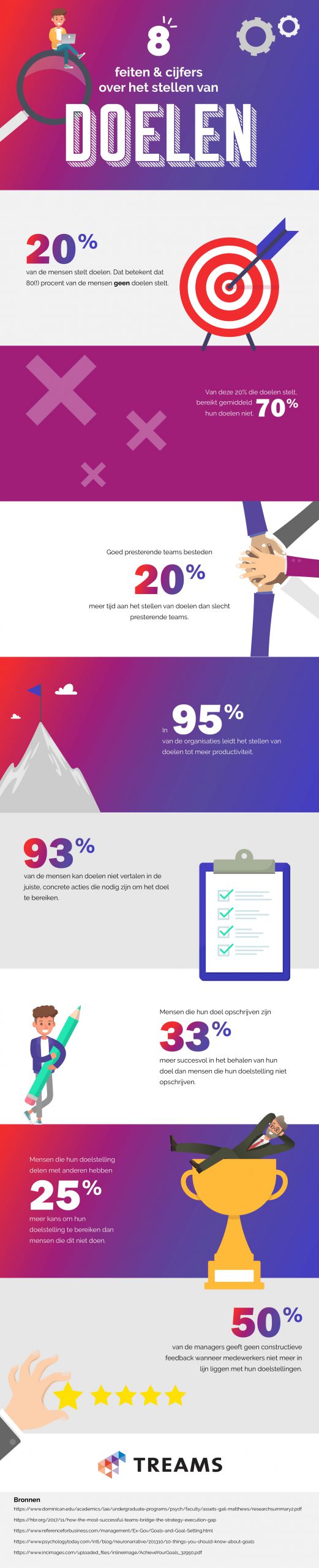 Hoewel we (bijna) allemaal heel hard werken, hebben we vaak het gevoel dat we niet bereiken wat we willen bereiken. De reden hiervoor is vaak dat we niet weten waar we naartoe willen, wat we willen bereiken. Stel je geen doelen? Dan voelt het net als reizen zonder landkaart. Je kan zo ver rijden als je maar wil, maar je bereikt uiteindelijk niets en zal verdwalen in alle wegen en straten. Het wordt niet langer geaccepteerd dat mensen op de automatische piloot door het leven gaan. Het risico op burn-outs, gedemotiveerde medewerkers en uitstroom van talent is namelijk veel te groot. Het is belangrijk om even stil te staan en doelen te stellen. Zo kom je uit die automatische piloot en neem je actief de leiding over je eigen ontwikkeling. Onderstaande feiten bewijzen de noodzaak van het stellen van doelen. Wil je weten hoe je op deze feiten en cijfers kan inspelen? Lees dan verder onder de infographic.