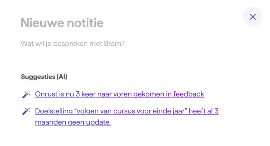 Geef leidinggevenden houvast met AI-ondersteuning. Van gespreksvoorbereiding tot suggesties voor feedback: managers krijgen precies de input die ze nodig hebben om hun mensen te begeleiden.