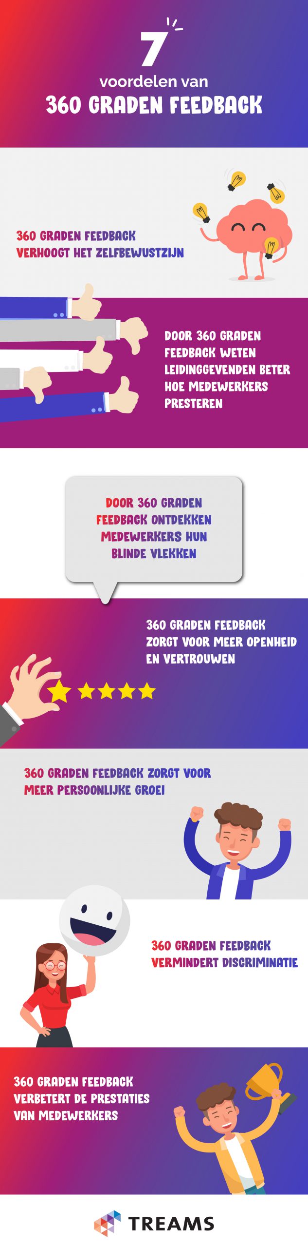 360 graden feedback is een methode waarbij je feedback vraagt aan verschillende mensen. Dit kunnen zowel collega’s als externen, zoals bijvoorbeeld klanten of leveranciers zijn. Al een aantal jaar ervaren verschillende organisaties de voordelen van deze manier van feedback vragen. In het begin werd dit gedaan met pen en papier, later in excel-bestanden en tegenwoordig gaat het heel gemakkelijk in een online tool als Treams . Door 360 graden feedback te vragen krijg je een compleet beeld van de ontwikkeling die iedere medewerker doormaakt. Hoewel 360 graden feedback veel voordelen heeft, wordt het in menig organisatie helaas nog niet ingezet. In deze infographic zetten we de voordelen voor je op een rijtje. Wil je meer weten? Lees dan zeker even verder onder de infographic.